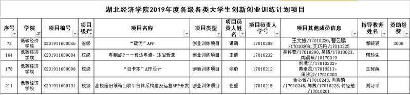 根据《教育部高等教育司关于公布2019年国家级老员工创新创业训练计划项目名单的通知》和《省教育厅关于公布2019年省级老员工创新创业训练计划项目的通知》(鄂教高函〔2019〕9号),公司1个项目获批为2019年省级老员工创新创业训练计划项目。同时,经学校审核, 3个项目被认定为公司2019年度校级老员工创新创业训练计划项目,项目具体名单如下: